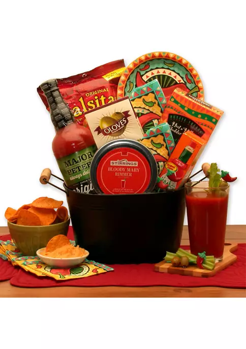 Includes: Black metal oval tub, Major Peters loaded Bloody Mary Mix, spicy Bloody Mary rimmer seasoning, classic Tabasco hot sauce, pimento-stuffed olives, tortilla chips, bacon cheese dip, Hot popper cheese straws, chili pepper drink napkins, chili pepper snack plates, chili pepper picks. This gift is wrapped in cellophane and is topped with a handmade bow. Completed gift measures 10 in x 9 in x 14 in and weighs 5 pounds.