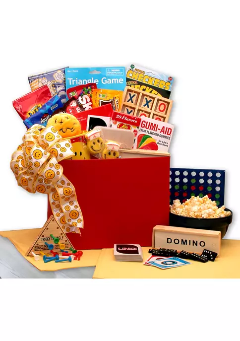 The A Smile A Day Get Well Gift Box includes: red gift box, Ritz Bitz cheese filled crackers, Buttery microwave popcorn, plain M & M candies, peanut M & M candies, Fruit flavored skittles, animal cookies, Fruit flavored gummy band aides, wooden triangle peg game, checkers, Dominos, Band Aide shaped playing cards, Uno card game, ceramic smiley face coffee mug, smiley face stress relief ball, 2 smiley face frosted suckers, 20 flavor jelly belly box, wooden Tic-Tac-Toe game. Topped with a cheerful smiley face handmade bow and wrapped in cellophane. Completed gift measures 10 in L x 8 in W x 16 in H and weighs 4 pounds.
