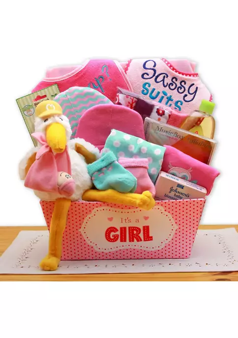 The Special Delivery New Baby Gift Basket includes: plush stork, Baby lullaby CD, baby brush & comb set, Johnson & Johnson baby shampoo, Johnson & Johnson baby soap, receiving blanket, set of 4 baby washcloths, two 100% cotton baby beanie’s, two 100% cotton baby bodysuits, two 100% cotton baby bootie sets, two bibs, It’s A Boy gift box. This gift measures 12 in L x 9 in W x 13 in H land weighs 6 pounds. This gift comes wrapped in cellophane and is topped with a handmade bow.