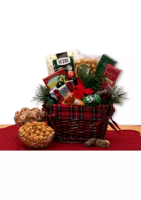 Includes: Beth’s chocolate chip cookies, Butter toffee caramel corn, Stone wheat crackers, Almond Roca candy, Smoked almonds, 2 mint Ghirardelli chocolate squares, Milk chocolate Ghirardelli chocolate square, Wisconsin cheese triangle, 3 oz. beef salami, milk chocolate Lindt Truffle, Dark stain wicker basket with a plaid fabric liner. Gift measures 11 in L x 8 in W x 16 in H when complete and weighs 4.2 pounds.