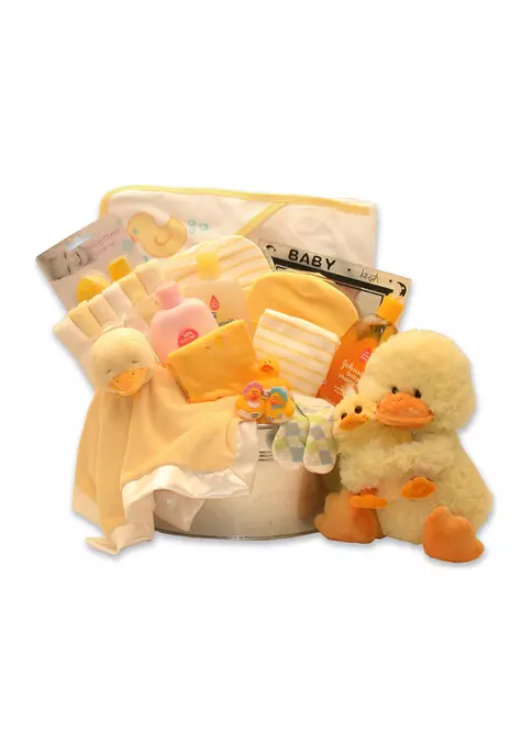 Includes: Baby Wash Tub (12-inch round), 7 oz. Johnson & Johnson Tearless Baby Shampoo, 12-inch Momma Duck and 3-inch baby duck, Ultra plush baby duck security blanket, a 100% Cotton Tee Shirt, Hooded Baby Bath Towel (various designs, not all are ducks), 2 Baby Caps, 4 Terry Cloth Wash Cloths, 5×7 Baby Picture Frame (holds a 3×5 photo), Rubber ducks (1 momma and two babies), Baby Bootie set (assorted styles), Baby Brush & Comb Set, 9 oz. Johnson & Johnson Baby Lotion, 9 oz. Johnson & Johnson Baby Wash.