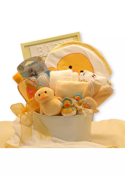 Includes: Baby Wash Tub 8-inch round, 7 oz. Johnson & Johnson Tearless Baby Shampoo, 2 100% Cotton Tee-shirts, Hooded Baby Bath Towel (various designs, not all are ducks), 2 Baby Caps, 4 Terry Cloth Wash Cloths, 5×7 Baby Picture Frame (holds a 3×5 photo), 3 Rubber Ducks (1 momma and two babies), Baby Brush & Comb Set, and Plush 6-inch baby Duck.