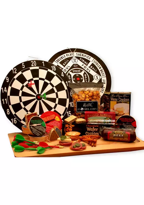 This gift includes: 12-inch 2 in 1 Dart Board set, 6 Darts, Creamy Brie Cheese Spread, Sharp Cheddar Cheese spread, Vegetable cheese dip, 2 Cheese wedges, Chocolate cream filled Wafer cookies, 2 oz. Smoked Almonds, 1 oz. Stone Wheat water Crackers, 5 oz. crunchy caramel corn, and 3 oz. Smokey Beef Salami.
