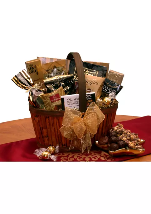 This gift basket includes: 9 oz Assorted chocolates, Belgian Truffles 1.2 oz, Chocolate Fudge 1.8 oz, Almond Roca 1.4 oz, Chocolate Fudge popcorn, Lindt Chocolate Bar, Monbana Truffles, Chocolate covered nuts 1.8 oz, Chocolate cream wafer cookies 6 oz, Bellagio chocolate cappuccino, Malta Bella Chocolate toffee. Lindt Truffle ball, and finished with a hand-tied shimmering gold bow.