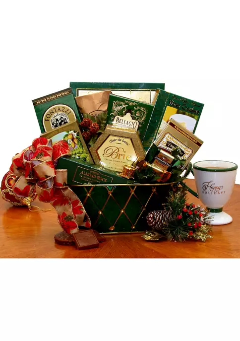 The Christmas Trimmings Holiday Gift Basket includes: Butter toffee pretzels, creamy Brie cheese spread, smoked almonds, Ghirardelli mint cream filled milk chocolate square, Ghirardelli milk chocolate square, Three pepper crackers, Chocolate Truffle Cookies, Bellagio white chocolate cocoa, Chocolate fudge brownie, 5 oz classic beef salami, Almond Roca milk chocolate & toffee candy, enclosed by an elegant green metal tray with gold criss-cross designs. The completed gift weighs 4 pounds.