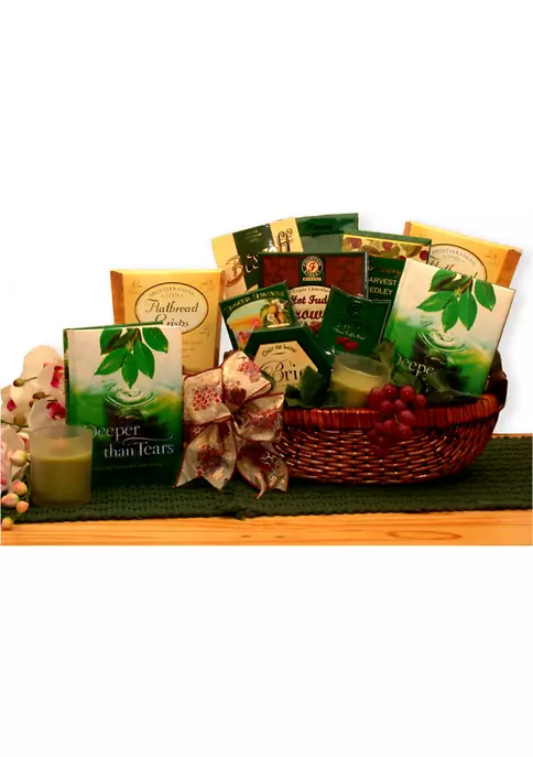Includes: dark stain tray, Mediterranean flatbread crisps, smoked almonds, Chambery truffles, cranberry harvest trail mix, hot fudge brownie, Biscoff European cookies, Skinny dipping pretzels, Brie cheese spread, pillar candle, and a Deeper Than Tears sympathy gift book. Gift measures 12 in L x 10 in W x 13 in H and weighs 6 pounds.