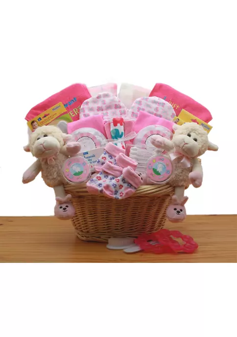 The Double Delight Twins New Babies Gift Basket includes: 2 sweet plush lambs with baby bunny slippers on, 2 footprint kits, 2 My First Tooth & Curl keepsake boxes, two 100% cotton baby bodysuits, two 100% cotton baby beenies, two 100% cotton baby bootie sets, two 100% cotton baby bibs, wash cloth set, 2 receiving blankets, brush and comb set, baby manicure set, Johnson & Johnson baby soap, Baby q-tips, 2 gel filled teethers, wicker laundry hamper. This gift measures 16 in L x 12 in W x 14 in H and weighs 9 pounds. This gift comes wrapped in cellophane and topped with a handmade bow.