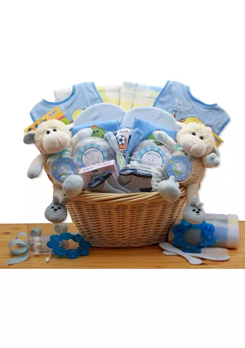 – 2 sweet plush lambs with baby bunny slippers on, 2 footprint kits