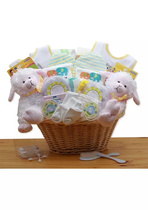 The Double Delight Twins New Babies Gift Basket includes 2 sweet plush lambs with baby bunny slippers on, 2 footprint kits, 2 My First Tooth & Curl keepsake boxes, two 100% cotton baby bodysuits, two 100% cotton baby beanies, two 100% cotton baby bootie sets, two 100% cotton baby bibs, washcloth set, 2 receiving blankets, brush and comb set, baby manicure set, Johnson & Johnson baby soap, Baby q-tips, 2 gel-filled teethers, wicker laundry hamper.