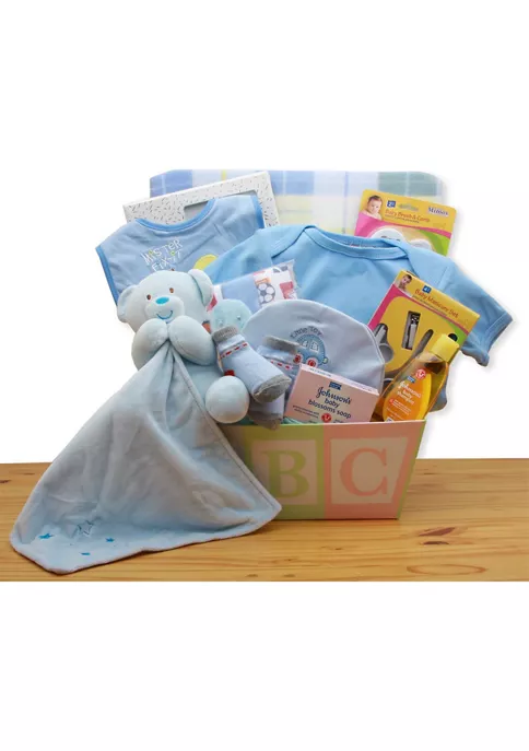 The Easy as ABC New Baby Gift Basket includes: ABC gift box, baby bib, baby brush & comb set, baby manicure set, Johnson & Johnson baby shampoo, a set of 4 baby washcloths, Johnson & Johnson baby soap, baby photo frame, 100% cotton baby bodysuit, 100% cotton baby beanie, 100% cotton baby bootie set, an ultra-soft baby teddy bear holding his security blanket. This gift measures 12 in L x 9 in W x 13 in H and weighs 6 pounds. This gift comes wrapped in cellophane and is topped with a handmade bow.