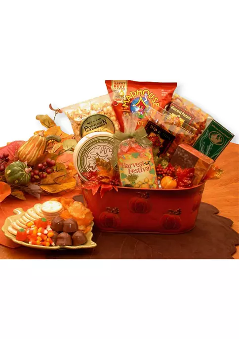 Set Includes: Pretzels, Butter toffee Caramel corn, Assorted chocolates, Harvest Cocoa, shortbread Cookies, Cheese spread, stone wheat crackers, Fall candy corn mix.