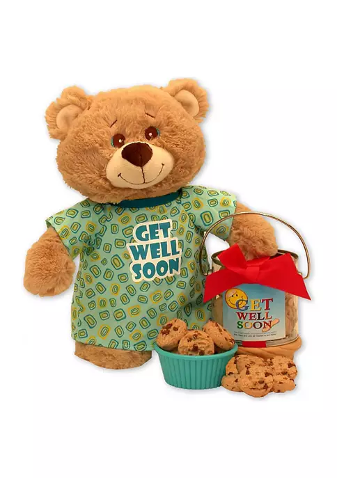 Gift includes:16-inch plush get well teddy bear with hospital gown, mini paint pail filled with 12 chocolate chip cookies.