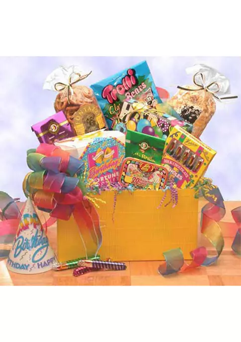 Includes: Happy Birthday Fortune Cookies, Chocolate Birthday Candles, 1 oz. Jelly Belly Asst Jelly Beans, Licorice Petites candy, 3 oz. Assorted Gummy Bears, Butter Toffee Pretzels, 5 oz. Caramel Corn, Cherry bon bon tin, Pastel mints in birthday paper, and Yellow Gift Box with a Rainbow Birthday Ribbon.