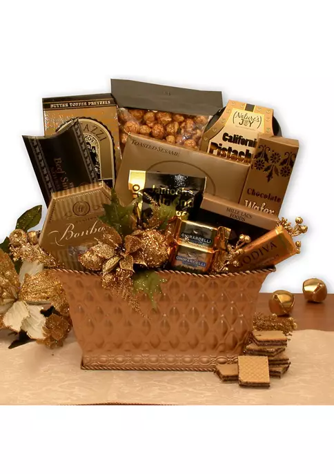 The Golden Gatherings Holiday Gift Basket includes: Embossed gold tin, assorted fruit bon bon candies, sliced summer sausage, butter toffee pretzels, toasted sesame crackers, caramel corn, Godiva milk chocolate bar, Ghirardelli caramel milk chocolates, Jamocha Almond coffee, camembert cheese spread, California pistachios, chocolate cream wafer cookies. Adorned with gold enhancements and topped with a handmade bow. This gift measures 13 in L x 13 in H x 9 in W and weighs 3 pounds complete.