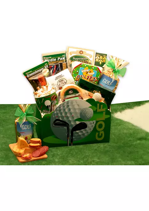 This gift includes: Golfers Fortune Cookies, Golf Ball Magnet, Golf coffee mug, Golf Theme bag w/ Honey Sweet Peanuts, Hot Pepper Cheese, 3 oz. Summer Sausage, 3 Pepper water crackers, Seasoned pretzel dipping sticks, Caramel corn with peppermint, Greens Keeper turf kit (includes 12 ball spotters & steel divot tool), Birdie pack (Includes, divot repair tool, ball markers & tee scrub brush), Golf Tees, Chocolate cream filled wafer cookies, and Large Golf Theme Gift Box.