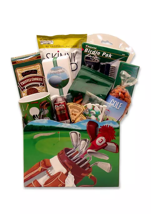 This gift includes: Golfers shortbread cookies, Golf coffee mug, Golf Birdie Kit, Golf Tees (30 pack), Golf Theme bag w/ Honey Sweet Peanuts, Cheese wedges, 3 oz. Summer Sausage, Chocolate Truffle cookies, 1/2 oz. stone wheat crackers, Pretzel sticks, White Cheddar popcorn, and Large Golf Theme Gift Box.