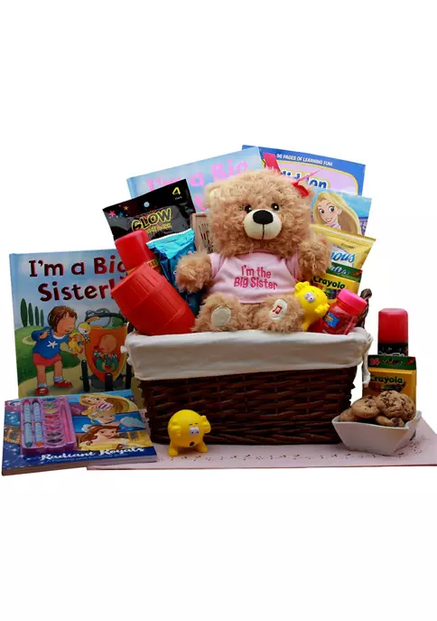 The I’m The Big Sister Children’s Gift Basket includes: I’m the Big Sister teddy bear, I’m The Big Sister Book, Barrel of Monkey’s, Bubbles, Emoji stress toy, Crayola crayons, Maze & dot to Dot activity book, glow pack, silly string, Crayola activity set, pick up Stix, Famous Amos chocolate chip cookies, Rice Krispy treat, fabric lined hamper to store toys. This gift measures 12 in L x 10 in W x 14 in T and weighs 6 pounds. This gift comes wrapped in cellophane and topped with a handmade bow.