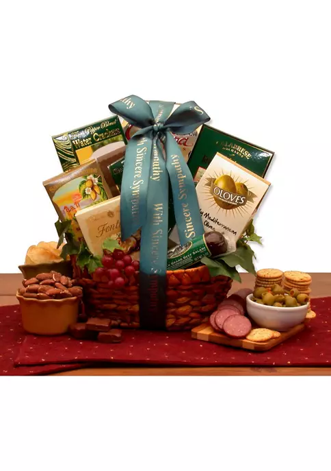 The In Loving Memory Sympathy Gift Basket includes: Three pepper water crackers, smoked almonds, Fontina creamy cheese spread, chocolate covered graham crackers, 3 oz beef summer sausage, pimento-stuffed Mediterranean olives, cranberry harvest trail mix with nuts, Bistro style cuccina chips. This gift basket comes in a natural seagrass woven basket adorned with grapes and leaves. This gift basket measures 11-inches long by 8-inches wide and is 14-inches tall, weighs 4 pounds, is wrapped in cellophane, and topped with a custom With Sincere Sympathy hand-tied bow.