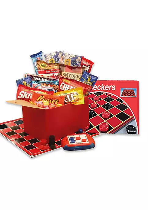 The Medium Its Game Time Boredom & Stress Relief Gift Set includes: Cracker Jacks, buttery microwave popcorn, Snyder’s pretzels, Oreo cookies, Mini Chips A Hoy cookies, Reese’s, Peanut M & M’s, Plain M & M’s, 2 oz. Planters Peanuts, Skittles, Tootsie Rolls box, Playing cards, checkers, hand held travel size activity game, Red gift box.