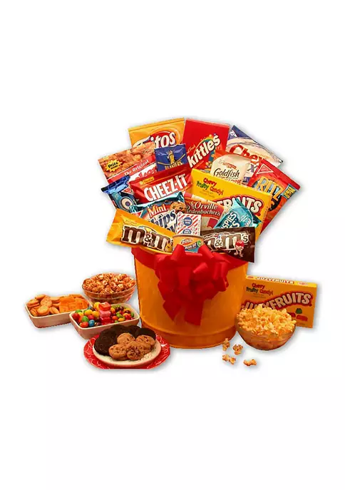 Includes: Bright yellow 6 quart pail, Peanut M & M’s, M & M plain, Chips a Hoy mini snack cookies, Oreo Cookies, Movie Butter Microwave popcorn, Rice Krispies Treats, Juju Fruits Candies, Cheez-Its Crackers, Fritos Chips, Skittles, Goldfish Miniature crackers, Ritz Bits cheese filled crackers, Planters peanuts, and Fritos mini bean dip.