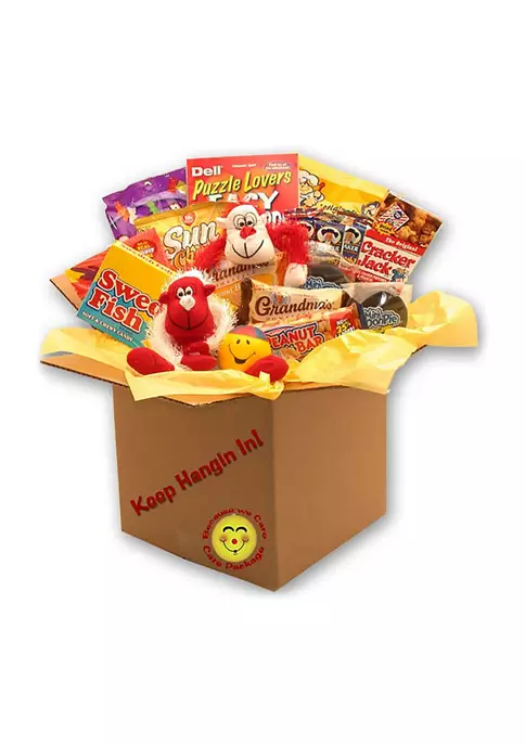 The Keep Hangin In There Care Package includes: Crossword book, Gummy bears, Vanilla Caramels, Cracker Jacks, 3-Quaker Granola bars, 2 Mini Moon Pies, 2-Grandma cookies, Peanut Bar, Lemon heads candies, Swedish fish candies, Sun chips, Smiley face stress ball.