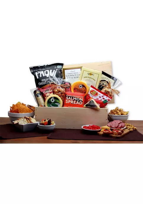 The Macho Munchies Crate includes: Paqui Haunted Ghost pepper tortilla chips exploding with flavor, Three Cheese Sourdough Crackers, California Crunch Dried Fruit & Nut Mix, Fontazzi Butter Toffee Caramel corn, Jelly Belly Tabasco jelly Beans, Alaskan Salmon Spread, perfect when paired with cream cheese and crackers, Classic Wisconsin cheddar Round, Smoked pepper Gouda Cheese Round, Walkers chocolate chip cookies, 5 oz. Garlic summer sausage, 5 oz. garlic and herb summer salami, honey roasted peanuts, Premium salted cashews, 14-inch pine crate with lid. Completed gift comes sealed and tied with a hand made bow. Gift Measures 14 in L x 10 in W x 8 in H and weighs 8 pounds.