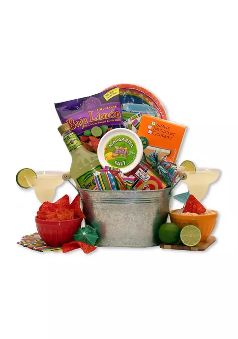 Gift Includes:11-inch galvanized pail, Baja Lime tortilla chips 4 oz, Margarita salt 8 oz, Fiesta Dip Mix, Simply Indulgent Gourmet Savannah Style sweet shortbread cookies 5 oz, Margarita Fiesta napkins, Margarita Fiesta paper plates, Margarita umbrellas, Jose Cuervo Margarita Drink Mix 33 oz (Non-Alcoholic). Completed gift measures 11 in L x 8 in W x 14 in H and is wrapped in cellophane and is topped with ah and made bow. Completed gift weighs 4 pounds.
