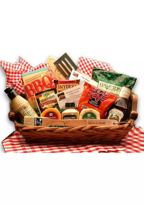 Includes: Grill Classics Barbeque Sauce, Uncle Rays Barbeque Chips, BBQ Party Snack Mix, Grill Creations Marinade Mix, Classic Italian Marinade, Hot pepper Cheese Round, Wisconsin Smokey Cheddar Cheese Round, Snyder’s Pretzels, 2 BBQ Utensils, 2 Gourmet BBQ Recipe Cards for Beef, Watson Street Dijon Marinade Mustard, Hampton Farms Salty Peanuts in the Shell, Wooden Slicing/Cutting Board, and Wicker Tray.