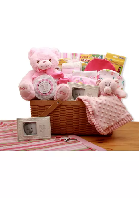 The My First Teddy Bear New Baby Gift Basket – Pink includes Plush My First Teddy bear, Baby Footprint Kit, First Teddy security blanket, baby photo frame, 2 100% cotton baby bodysuits, 2 100% cotton baby beanie’s, 2 100% cotton sets of booties, baby washcloths, baby brush and comb set, baby manicure set, baby teether, receiving blanket. This gift measures 12 in L x 10 in w x 14 in H and weighs 6 pounds. This gift comes wrapped in cellophane and topped with a handmade bow.