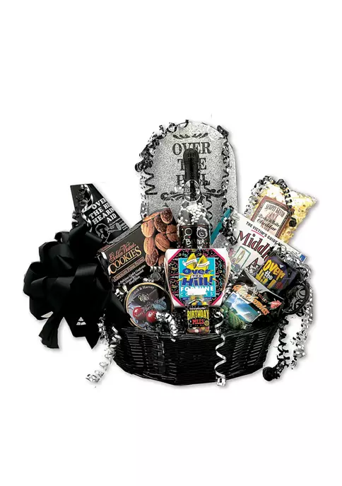 The Large Over the Hill Birthday Gift Basket includes: 6-inch Over the Hill Tombstone, Over the Hill Fortune Cookies, Over the Hill Pills, Over the Hill Mug, Caramel salted cookies, 3 oz. Chocolate Fudge Popcorn, 5 oz. Salted pretzel rods, Over the Hill Theme Bag with Candies, Over The Hill Pork & Beans Can for Regularity, Victims Guide to Birthdays, Over the Hill Hearing Aide, 1.5 oz. White Cheddar Popcorn, Cherry Sours tin, Black Oval Tray.