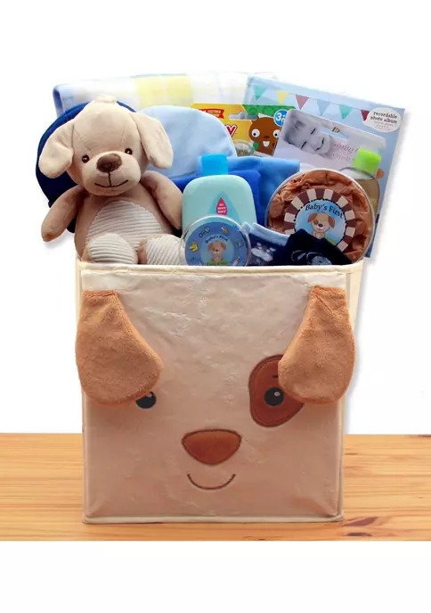 The Puppy Tails New Baby Gift Basket includes: puppy storage bin, plush puppy, baby tooth & hair keepsake box, baby footprint kit, baby photo album, baby brush and comb set, Johnson & Johnson baby wash, Johnson & Johnson baby shampoo, baby receiving blanket, two 100% cotton baby beanie’s, two 100% cotton baby body suits, two 100% cotton baby bootie sets. This gift comes wrapped in cellophane and is topped with handmade bow. This gift measures 12 in L x 12 in W x 18 in H and weighs 8 pounds.
