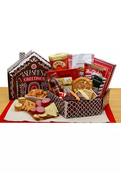 The Seasons Greetings Holiday Care Package includes: Season’s Greeting gingerbread house box, Old Fashioned vanilla caramels, Stewart’s Peppermint candies, Three Pepper water crackers, 5 oz. Beef summer sausage, 2 oz. cranberry cheddar cheese triangle, 2 oz. Wisconsin Swiss cheese triangle, Sweet n savory dill mustard, Ghirardelli Peppermint Bark Squares, Mrs. Fields Cookies, Old Fashioned Peanut Brittle, Chocolate Gram squares. This gift comes closed and sealed as a care package.