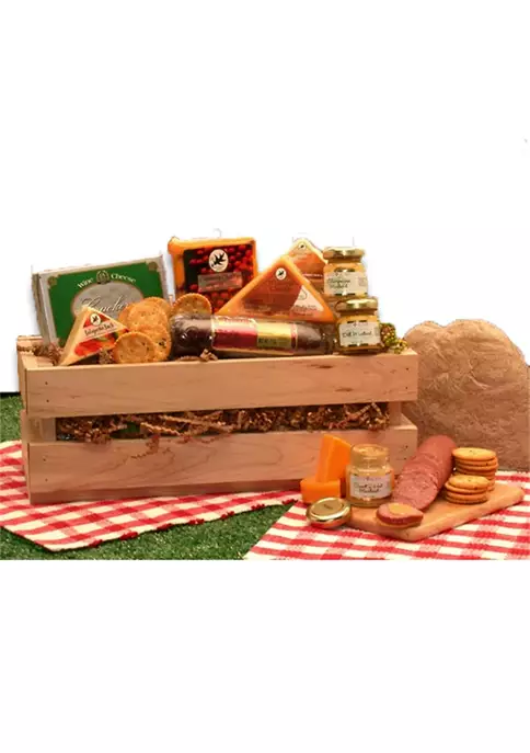 Includes: Wooden Crate, Swiss cheese triangle, Wisconsin Cheddar cheese triangle, Water Crackers, Jalapeno Cheese Triangle, Grained Mustard, Champagne Mustard, Bavarian Beef Salami, and Cranberry Cheese.