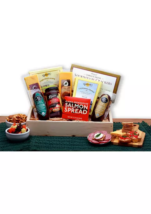 The Simply Savory Gourmet Snack Tray includes: California Crunch dried fruit and nut mix, California Crunch salty snack mix, Three Cheese sourdough crackers, 4 oz classic Wisconsin cheese bar, 4 oz Chipotle Cheese Bar, 5 oz Garlic Summer Sausage, 5 oz Beef Salami, Red Pepper Jelly, 3.25 oz Alaskan smoked Salmon spread hand-made pine serving tray. This gift comes wrapped in cellophane and topped with a handmade bow, completed gift measures 10-inches long by 8-inches wide and 6-inches tall. Completed gift weighs 5 pounds.