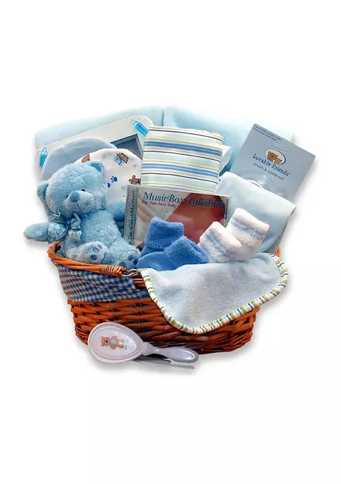 Includes: Plush baby teddy bear, Baby Lullaby Cd, 2 pairs baby booties, 2 baby tee shirts, 2 baby beanies, 2 baby receiving blankets, baby photo frame, baby brush and comb set, baby bib, fabric lined hamper. Gifts measures 12 in L x 9 in W x 14 in H and weighs 5 pounds. (Plush teddy style will vary and Baby towels, blankets and clothing designs will vary and may not all be identical to the photo.)