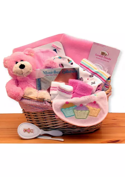 Includes: Plush baby teddy bear, Baby Lullaby Cd, 2 pairs baby booties, 2 baby tee shirts, 2 baby beanies, 2 baby receiving blankets, baby photo frame, baby brush and comb set, baby bib, fabric lined hamper. Gifts measures 12 in L x 9 in W x 14 in H and weighs 5 pounds. (Plush teddy style will vary and Baby towels, blankets and clothing designs will vary and may not all be identical to the photo.)