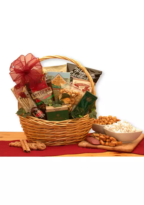 Includes: White cheddar popcorn, Snyder’s pretzel twists, butter toffee caramel corn, Famous Amos chocolate chip cookies, Dolcettos cream filled pastry roll cookies, Stone wheat crackers, Chambery truffles, Honey Mustard sourdough pretzel nuggets, Old fashioned vanilla caramels, Petite fruit candies 12-inch honey stain willow basket with handle, greenery and a hand tied bow.