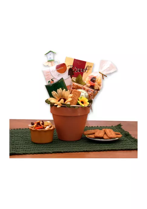 Includes: 6-inch Clay Pot, 2 oz Sweet & Crunchy Trail Mix, Vanilla Ice Tea Mix, Chocolate Cream Filled Wafer Cookies, Old Fashioned Vanilla Caramels, Wildflower Honey, 2 Miniature Tools, and 1 Wooden Bird House.