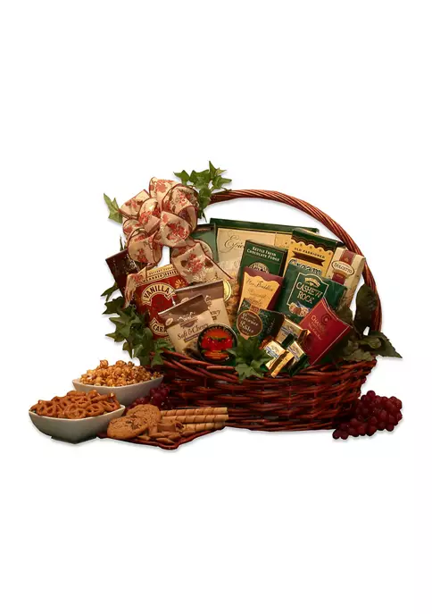 Cherry Bon Bon Candies, Licorice Petites candies, cream-filled pastry roll cookies, 2 Chewy Brent & Sams chocolate chip cookies, Old Fashioned cream puff cookies, Cashew Roca toffee, raspberry fudge cake, chocolate cream-filled vanilla wafer cookies, 3 assorted Ghirardelli squares, Old Fashioned vanilla caramels, Chambery truffles, Claey’s Old Fashioned Fudge, Butter Toffee Pretzels, Butter Toffee caramel corn, 14-inch dark stain basket with handle decorated with greenery and a handmade bow.