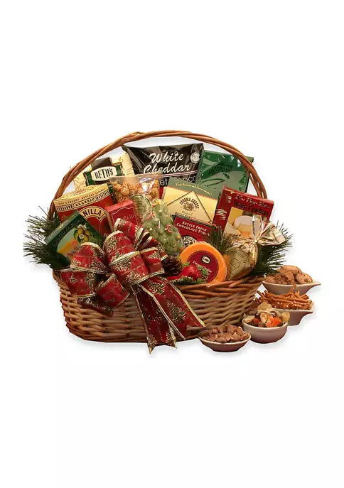 Includes: Beth’s Chocolate chip cookies, White cheddar popcorn, Buttery pretzel sticks, Old fashioned vanilla caramels, Smoked almonds, Almond Roca chocolate and toffee candy, Claeys old fashioned fudge, Three pepper water crackers, Sonoma smoked cheese straws, Deluxe mixed nuts, Wisconsin cheese round, Butter toffee caramel corn, Old fashioned Christmas tree pop decorated with spruce and pine cones and enclosed in a two tone wicker basket. Gift measures 14 in L x 10 in W x 16 in H and weighs 5.7 pounds when complete.