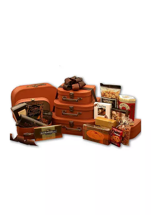 Includes: 3 pc Faux Leather Suitcases, Three Pepper Crackers, Cocoa Comfort Vanilla Cream Cocoa, Sliced Beef Salami, Honey Sweet Peanuts, Ghirardelli Chocolate Bar, 1.9 oz Brent & Sams Chocolate Chip Cookies, Assorted chocolate truffles, Old Fashioned Peanut Brittle, Buttery Pretzels sticks, Roasted Garlic Cheese Spread, Caramel Nut Caramel Corn, Vanilla Caramels, Cajun Spice Pretzel Sticks, and Gourmet Roast Coffee.