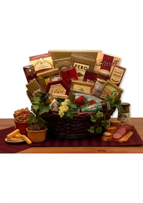 The Ultimate Gourmet Gift Basket includes: Pimento stuffed olives, 5 oz. Bavarian style summer sausage, California dried strawberry fruit, creamy Brie cheese spread, stone ground mustard, Almond Roca toffee, three pepper water crackers, chocolate cream filled vanilla wafer cookies, Sonoma cheese straws, Kettle fresh fudge, Chambery French truffles, Vineyard Estates Merlot cheese, smoked almonds, cranberry harvest fruit & nut snack mix, Chocolate wafer roll cookies, Biscoff European butter cookie crisps, Perq coffee, Focaccia Parmesan crackers, classic dark stain willow tray.
