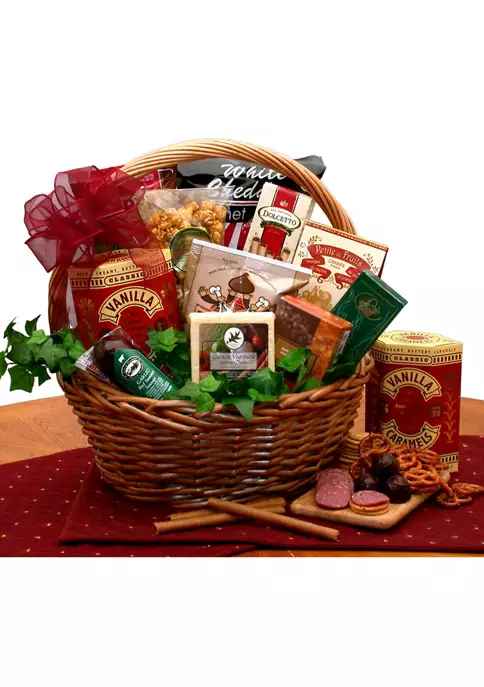 Includes: Creamy Vegetable dip, Petite Fruit Candies, Chocolate Truffles, Stone Wheat Crackers, Garlic Sausage, Vanilla Caramels, Chocolate Chip Cookies, Butter Toffee Caramel Corn, Snyder’s Pretzels, White Cheddar Popcorn and Cream filled pastry roll cookies. Finished and topped with a hand made burgundy bow this gift makes a true impression.