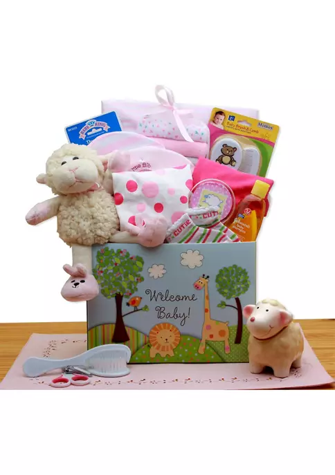 The Welcome New Baby Gift Box includes: Plush lamb with bunny booties, ceramic lamb piggy bank, Baby’s first tooth & Curl keepsake box, baby brush and comb set, baby manicure set, receiving blanket, set of 4 baby washcloths, two 100% cotton baby beanie’s, two 100% cotton baby bodysuits, two 100% cotton baby bootie sets. This gift measures 11 in L x 9 in W x 16 in H and weighs 8 pounds. This gift comes wrapped in cellophane and is topped with a handmade bow.