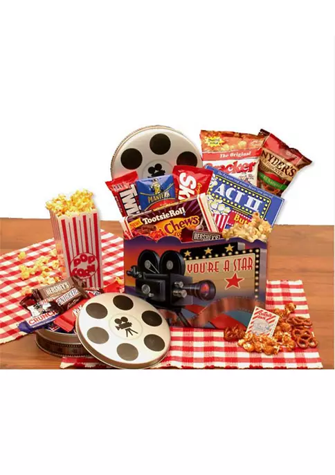 Includes: Movie Gift Box, Tootsie Rolls, Cracker Jack, Twizzlers, Planters Peanuts, Skittles, Act II Buttery Movie Popcorn, Snyder’s Pretzels, and Movie Roll Gift Tin Filled with Assorted Mini Candy Bars.